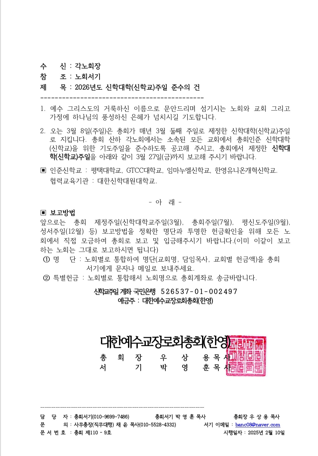 총회 제정 신학대학(신학교)주일 공문